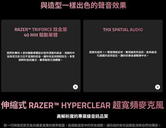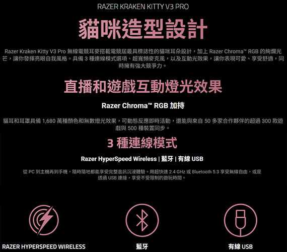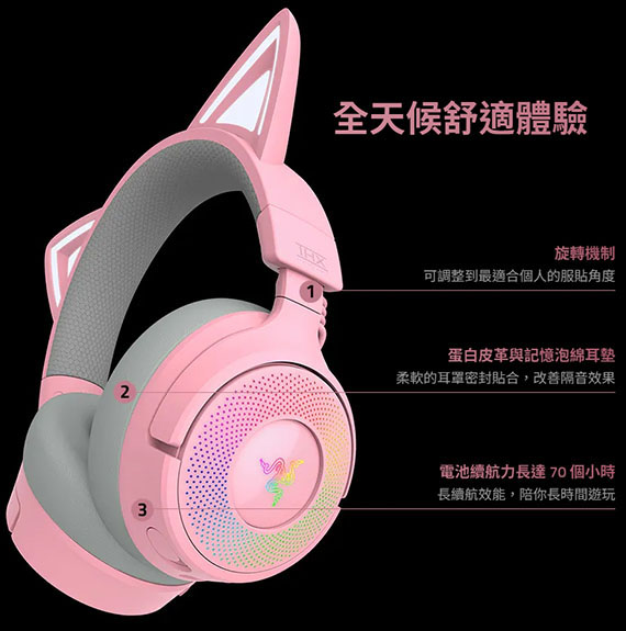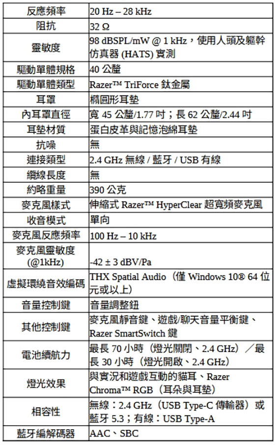 耳戴/耳罩式/護耳式/全罩,Razer TriForce 40mm驅動單體,2.4 GHz無線/藍牙/USB 有線,伸縮式Razer HyperClear超寬頻麥克風,電池續航力長達70個小時,標誌性的貓咪耳朵,直播和遊戲互動燈光效果,旋轉機制,蛋白皮革與記憶泡綿耳墊 NCC認證碼: CCAH24LP4260T7 BSMI認證碼: R39212