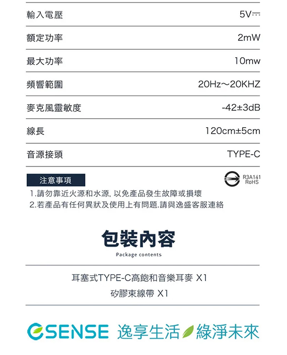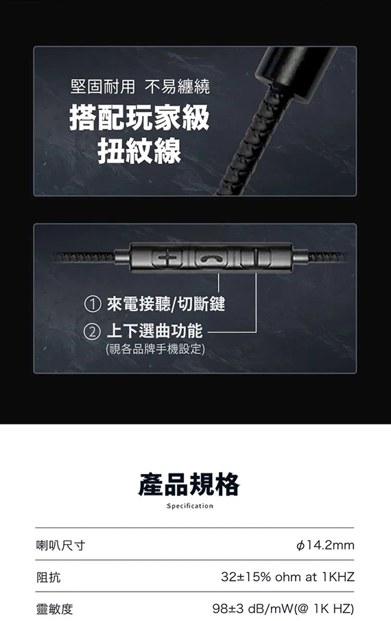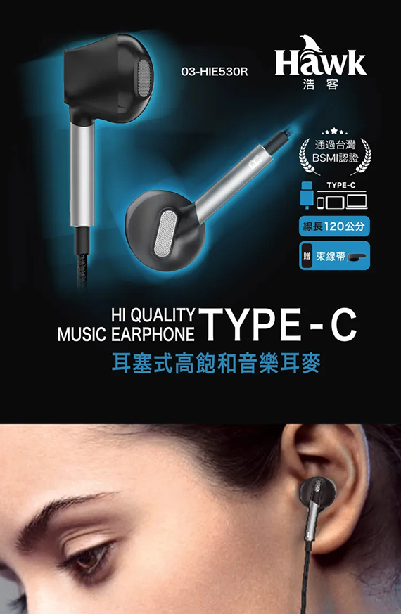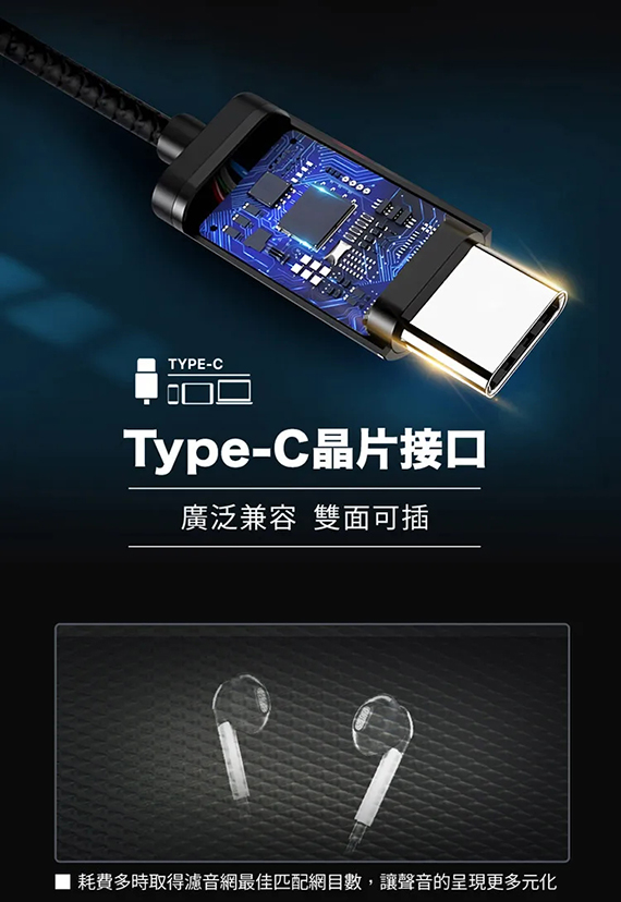 入耳式(耳塞),14.2mm驅動單元,TYPE-C內建音頻解碼晶片,濾音網最佳匹配網目數,符合美、中、韓三國Android線控耳機協議標準,玩家級扭紋線,高感度麥克風,保固一年 BSMI認證碼: R3A141