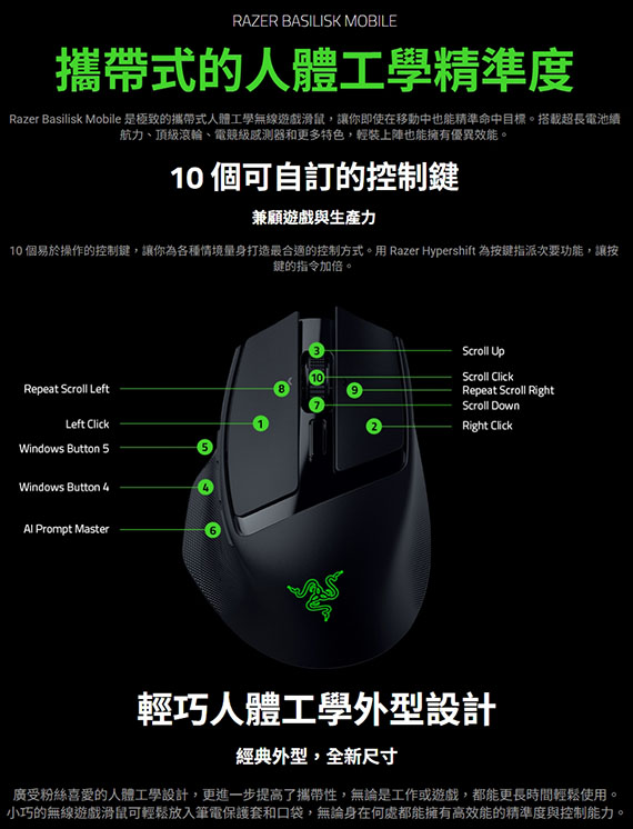 RAZER Basilisk Mobile 巴塞利斯蛇 三模無線 電競滑鼠 (RZ01-04310100-R3A1)