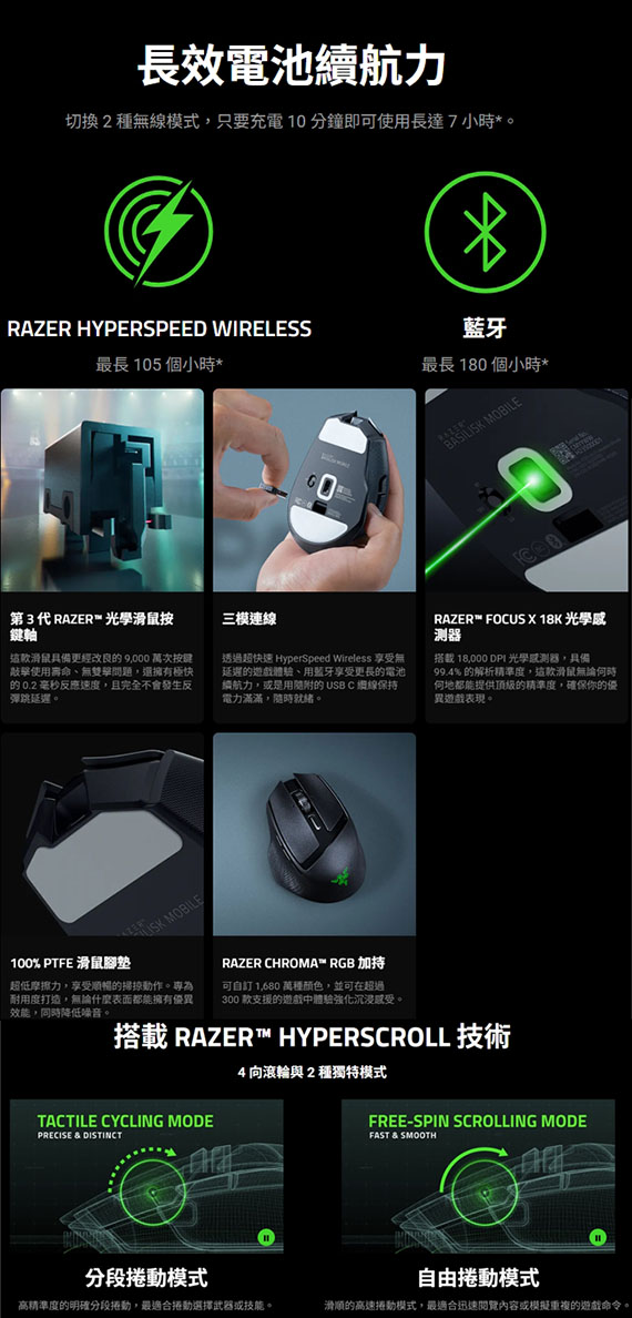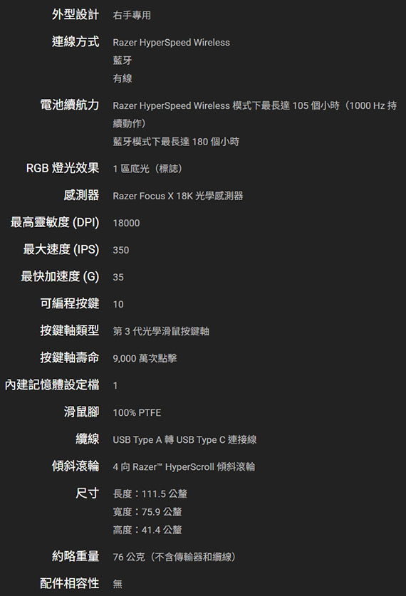三模連線(Razer HyperSpeed Wireless/藍牙/有線),Razer Focus X 18K光學感測器,第3代光學滑鼠按鍵軸,最高靈敏度(DPI)18000,最大速度(IPS)350,最快加速度(G)35,可編程按鍵10,滑鼠腳100% PTFE,USB Type A轉USB Type C連接線,4向Razer HyperScroll傾斜滾輪,輕巧人體工學外型設計,AI提示大師,2年保固 NCC認證碼: CCAH25LP2650T5 BSMI認證碼: R39212