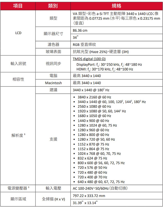 34吋,21:9寬螢幕,VA面板,解析度3440*1440(UltraWide QHD),180Hz更新率,反應時間1ms(MPRT),對比4000:1,亮度250cd/m2,輸入介面:HDMI(2.0)*2,DisplayPort*2,支援HDCP,3.5mm*1,搭載AMD FreeSync Premium技術,支援HDR10
