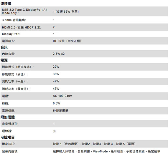 31.5吋,16:9寬螢幕,VA面板,解析度3840*2160(Ultra HD),更新率60Hz,反應時間4ms(MPRT),對比3000:1,亮度300cd/m2,輸入介面:HDMI(2.0)*2,DisplayPort*1,支援HDCP,3.5mm*1,內建喇叭2.5W*2, 支援壁掛VESA(100x100mm),HDR10,內建低藍光護眼技術,Eco-mode節能環保模式