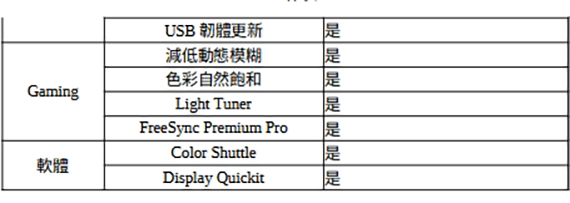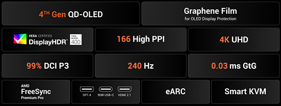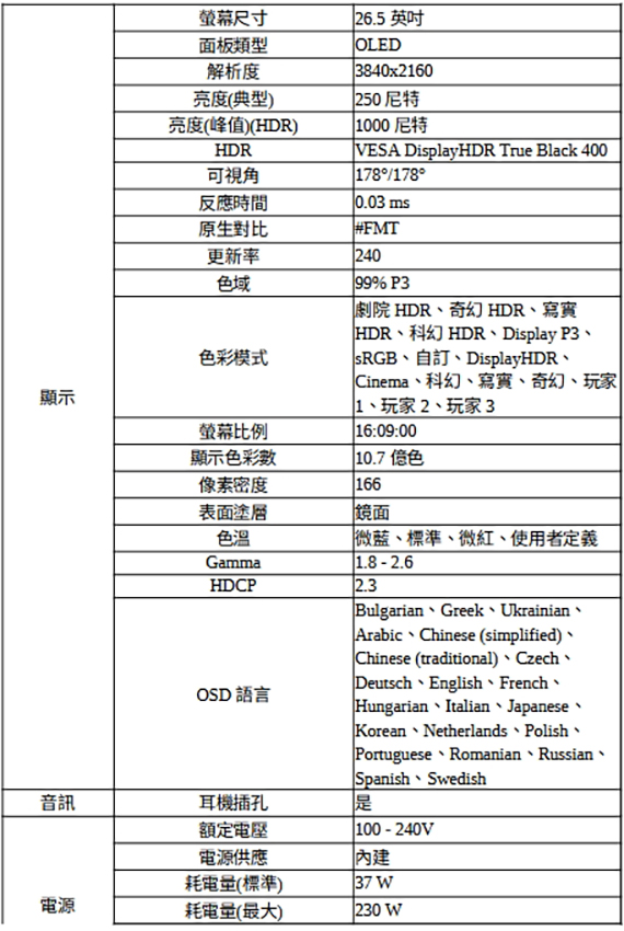 26.5吋,16:9寬螢幕,OLED面板,解析度3840x2160,更新率240Hz,反應時間0.03ms,原生對比1500000:1,亮度(典型)250尼特,亮度(峰值)(HDR)1000尼特,介面:HDMI2.1*2、DisplayPort1.4*1、USB C*1、USB Type-C 上行*1、USB Type-A 下行*2、USB Type-C 下行*1,支援HDCP,耳機插孔,不閃屏低藍光,FreeSync Premium Pro,Light Tuner,減低動態模糊,Color Shuttle,Display Quickit,玩色模式,三年保固