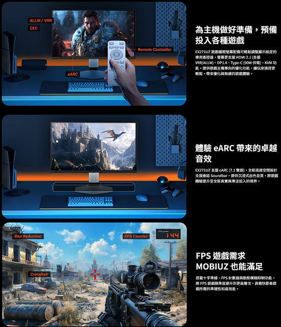 BenQ明基電通 MOBIUZ EX271UZ 27型 16:9 26.5吋 4K 遊戲護眼螢幕(OLED/0.03ms/240Hz/2H1DP1C/HDR1000)(限量 促銷價至 12/31 止)