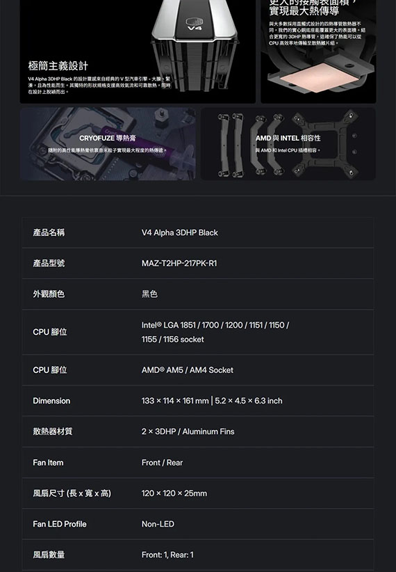 CoolerMaster V4 Alpha 3DHP 黑 120mm CPU散熱器 (MAZ-T2HP-217PK-R1)