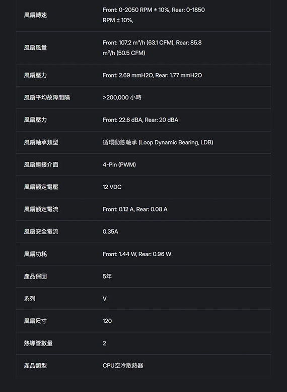 CPU腳位:Intel:LGA 1851/1700/1200/1151/1150/1155/1156 socket,AMD:AM5/AM4,風扇尺寸120*120*25mm,風量Front:63.1 CFM/Rear:50.5 CFM, 轉速:Front:0-2050RPM±10%,Rear:0-1850 RPM±10%,噪音Front:22.6dBA/Rear:20dBA,風壓Front:2.69mmH2O/Rear:1.77mmH2O,循環動態軸承,連接介面:4-Pin(PWM), Cooler Master專利3DHP技術,優異的散熱能力,預裝環形扇葉風扇,四根熱導管,5年保固