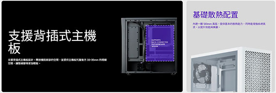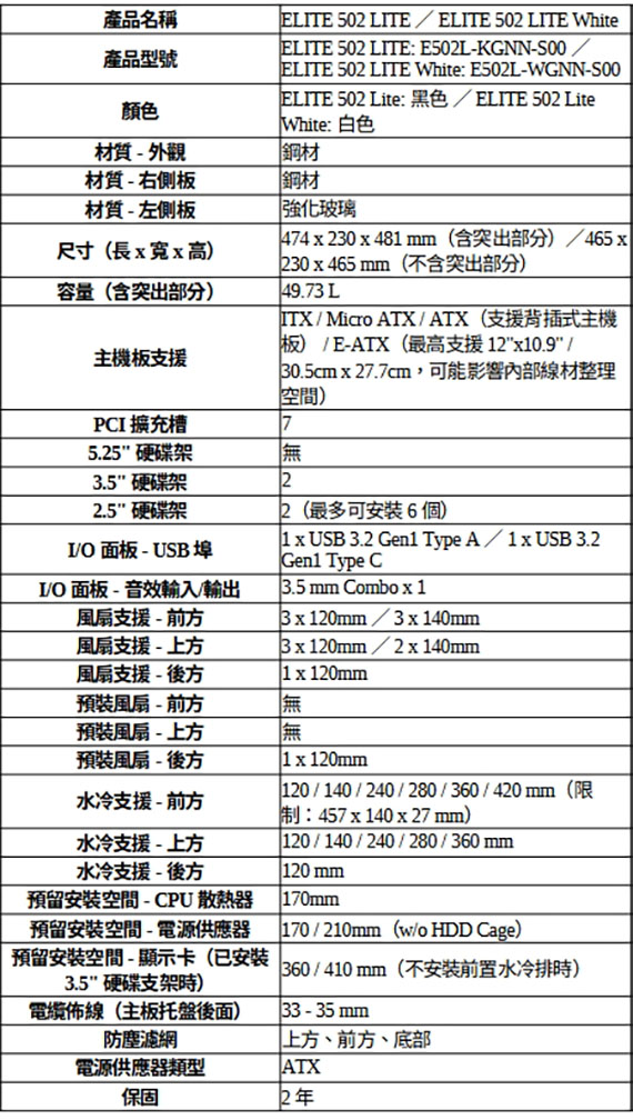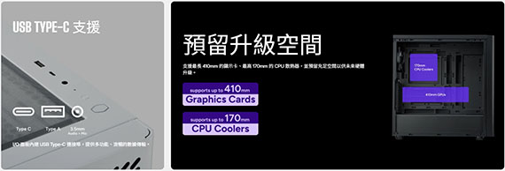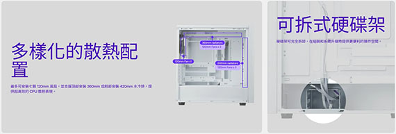 3.5吋*2+2.5 吋*2(最大6),支援主機板:ITX/Micro ATX/ATX,PCI擴充槽*7,支援CPU散熱限高170mm,顯卡VGA限長360/410mm,電源供應器PSU空間170/210mm,支援風扇(無標示內建即選購):後板120mm*1, 支援水冷(無標示內建即選購):前板120/140/240/280/360/420 mm,上板120/140/240/280/360mm,後板120mm,I/O介面:1*Type-C USB3.2 Gen1, 1*Type-A USB3.2 Gen1,1*3.5mm,多功能熱能選項,可拆卸硬碟籠