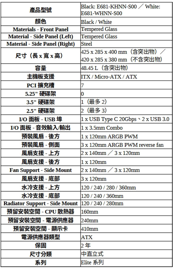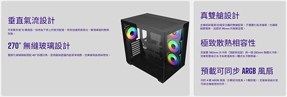 3.5吋*1(最多2個)+2.5吋*2(最多3個),支援主機板:ITX/Micro-ATX/ATX,PCI擴充槽*7,支援CPU散熱限高160mm,顯卡VGA限長410mm,電源供應器PSU空間240mm,支援風扇(無標示內建即選購):上板 120mm*3/140mm*2 ,後板120mm*1,側板120mm*3/140mm*2,底板120mm*3,支援水冷(無標示內建即選購):上板120/240/280/360mm,底板120/240/360mm,側板120/240/280mm,I/O介面:1*USB Type C 20Gbps,2*USB 3.0,1x 3.5mm, 270° 無縫玻璃設計,真雙艙設計,垂直氣流設計,預載可同步ARGB風扇,全網孔通風設計,支援RTX 50系列,2年保固