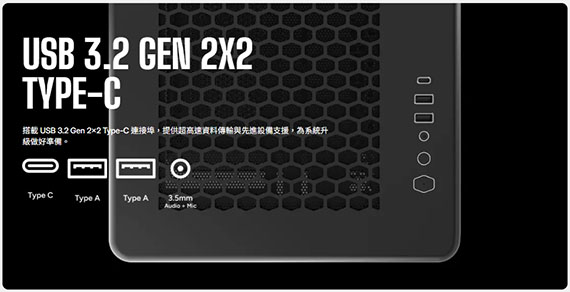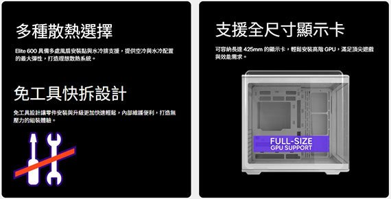 3.5吋*1+2.5吋/3.5吋(複合式)*1+2.5吋*2,支援主機板:Mini-ITX/Mini-DTX/Micro-ATX/ATX,PCI擴充槽*7,支援CPU散熱限高160mm,顯卡VGA限長425mm(含電源連接器),電源供應器PSU空間240mm,支援風扇(無標示內建即選購): 上板120mm*3/140mm*2,後板120mm*1,側板120mm*3/140mm*2,底板120mm*3,支援水冷(無標示內建即選購):上板240/280/360mm,底板240/360mm,側板240/280/360mm,後板120mm,I/O介面:1*Type-C USB3.2 Gen2, 2*Type-A USB3.1 Gen1,1x 3.5mm,免工具快拆設計,支援全尺寸顯示卡,2年保固