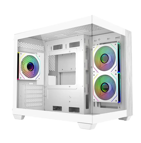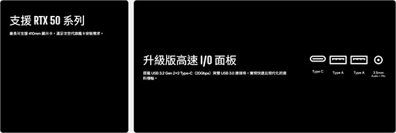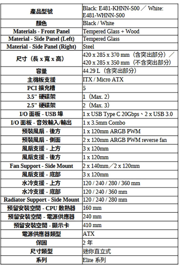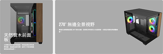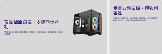 3.5吋*1(最多2個)+2.5吋*2(最多3個),支援主機板:ITX/Micro ATX,PCI擴充槽*5,支援CPU散熱限高160mm,顯卡VGA限長410mm,電源供應器PSU空間240mm,支援風扇(無標示內建即選購):上板120mm*3, 後板120mm*1,側板120mm*2/140mm*2,底板120mm*3,支援水冷(無標示內建即選購):上板120/240/280/360mm,底板120/240/360mm,側板120/240/280mm,I/O介面:1*USB Type C 20Gbps,2* USB 3.0,1x 3.5mm, 天然實木前面板,270° 無邊全景視野,預載ARGB風扇、同步控制,垂直散熱架構,支援RTX 50系列,2年保固