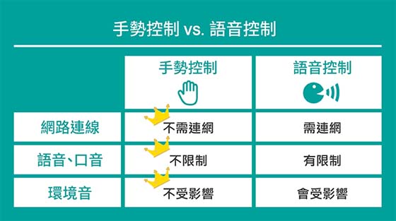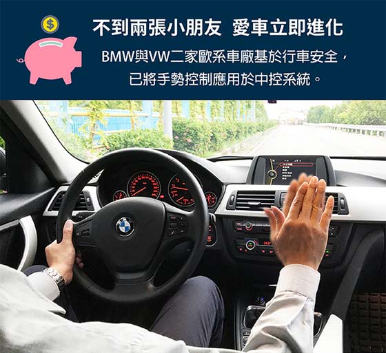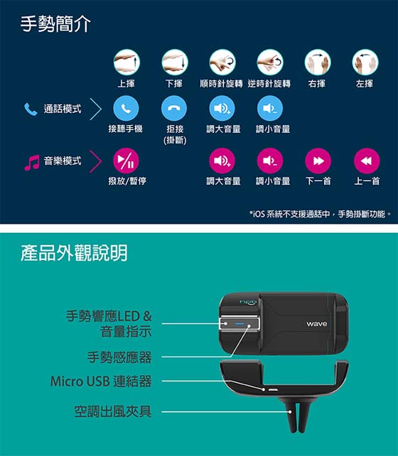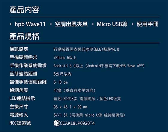 低功率藍牙V4.0通訊協定,藍牙連結距離6公尺以內,最佳手勢偵測距離:5~10 cm,偵測角度:42度(垂直與水平方向),利用藍牙連接手機,以手勢控制:接聽來電與播放音樂,除一般電話外並支援Line,Wechat,Skype,Messener等語音電話,結合手勢控制與手機車架二合一設計,配有冷氣出風口夾,或自行選購各種車架,可安裝大部分尺寸的手機,專用APP使用,支援iOS及Android使用,USB供電設計,輸入:5V/1.5A,主機尺寸:95 x 46.7 x 29 mm,NCC認證:CCAK18LP0920T4,國際條碼:4717904570411