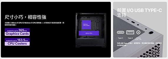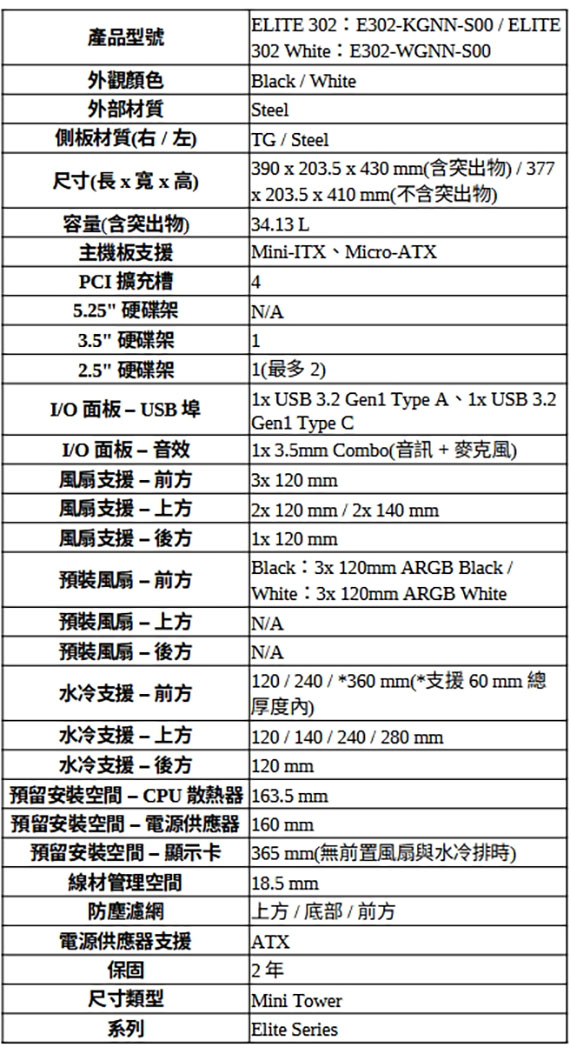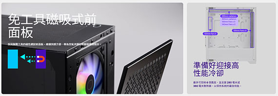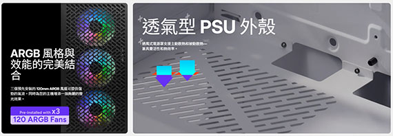3.5吋*1+2.5吋*1(最多2),支援主機板:Mini-ITX/Micro-ATX,PCI擴充槽*4,支援CPU散熱限高163.5mm,顯卡VGA限長365mm,電源供應器PSU空間160mm,支援風扇(無標示內建即選購):前板120mm*3, 後板120mm*1(內建120mm*1),上板 120mm/140mm*2,支援水冷(無標示內建即選購):前板120/240/360mm(限厚度60mm以內),後板120mm,上板120/140/240/280mm,I/O介面:1*Type-C USB3.2 Gen1, 1*Type-A USB3.2 Gen1,1*3.5mm,免工具磁吸式前面板,四顆預裝的120mm ARGB風扇,強化散熱的電源供應器護罩,2年保固