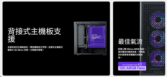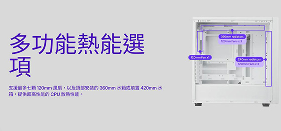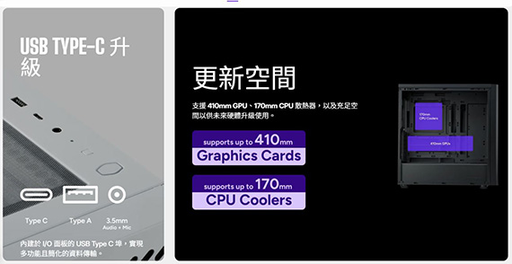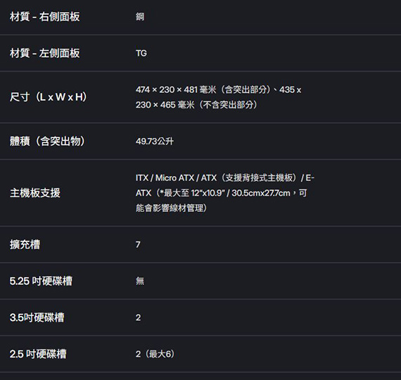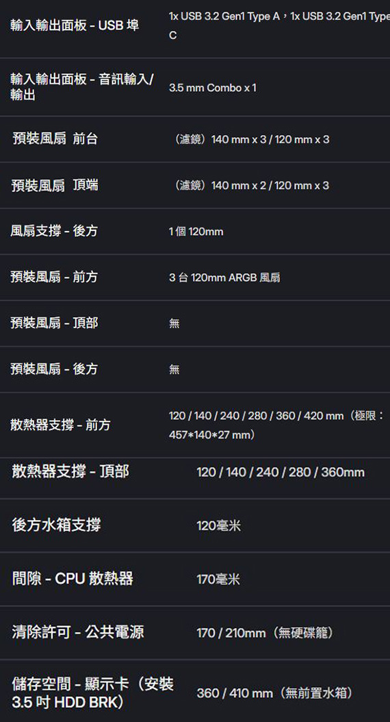 3.5吋*2+2.5吋*2(最多6),支援主機板:ITX/Micro ATX/ATX/E-ATX,PCI擴充槽*7,支援CPU散熱限高170mm,顯卡VGA限長360/410mm(無前置水箱),電源供應器PSU空間170/210mm(無硬碟籠),支援風扇(無標示內建即選購): 前板140mm/120mm*3,後板120mm*1,上板140mm*2/120mm*3,支援水冷(無標示內建即選購):前板120/140/240/280/360/420mm,後板120mm,上板120/140/240/280/360mm,I/O介面:1*Type-C USB3.2 Gen1, 1*Type-A USB3.2 Gen1,1*3.5mm,背接式主機板支援,配備三顆 120mm ARGB 風扇,多功能熱能選項,可拆卸硬碟籠,2年保固