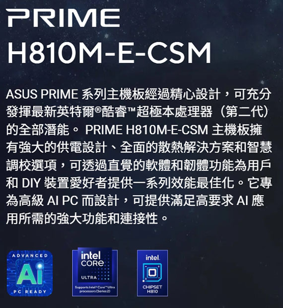ASUS華碩 PRIME H810M-E-CSM (m-ATX/DDR5*2/1H2DP/M.2*2/Realtek 1G/6+1+1+1相)