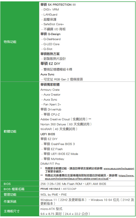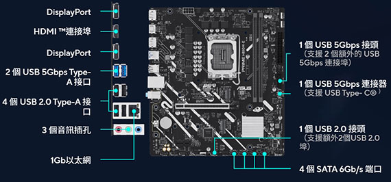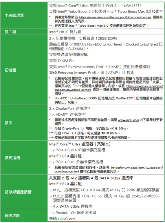Intel H810 Chipset,2*DDR5 up to 6400MT/s max128GB,1*PCIe 4.0x16slot,2*M.2,4*SATA 6Gb/s,2*DisplayPor1.4,1*HDMI2.1,Realtek 1Gb Ethernet,Realtek 7.1,I/O:2*USB Type-A 5Gbps、4*USB Type-A 2.0、3*Audio jacks,m-ATX,不鏽鋼背板,LANGuard,華碩 Q-Design,需搭配CPU晶片才能使用內顯功能,三年保固,登錄四年(90MB1N20-M0TAYC)