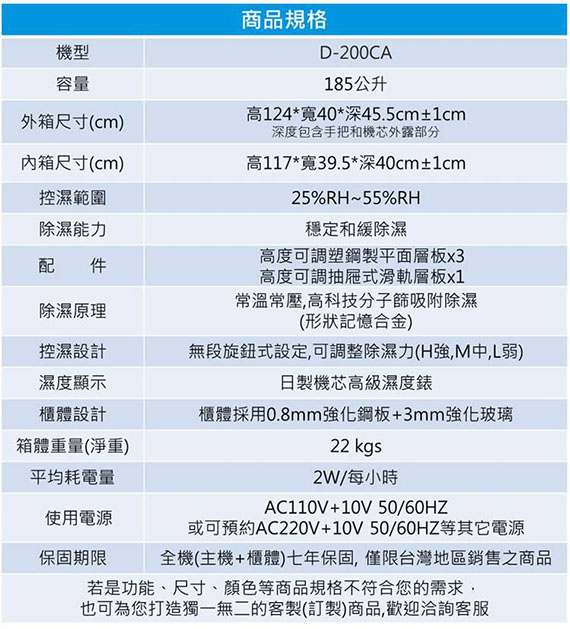 容量:185L,採智慧型無段式控制、高級濕度錶顯示,高分子物理吸附除濕( 形狀記憶合金),上下可調高低耐重鋼製層板 * 3,外箱:H1240xW400*D455mm,內箱:H1170x W395x D400 mm,,七年保固