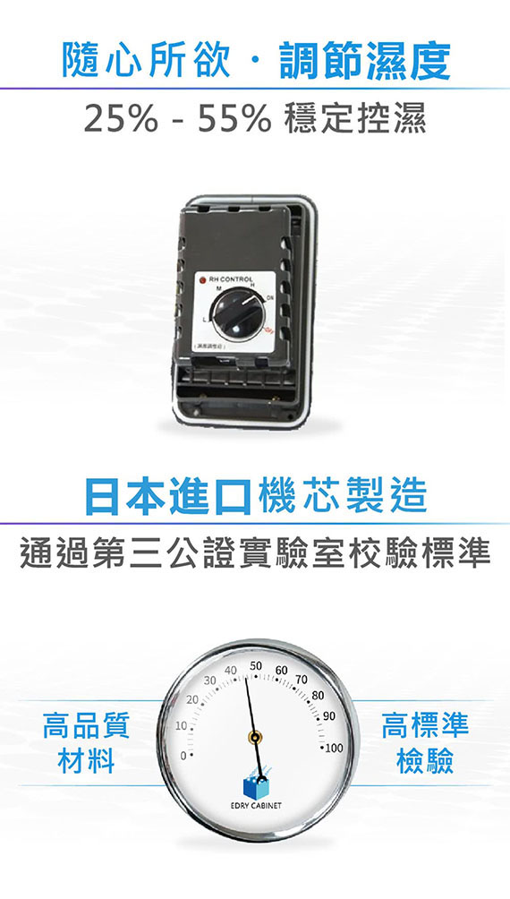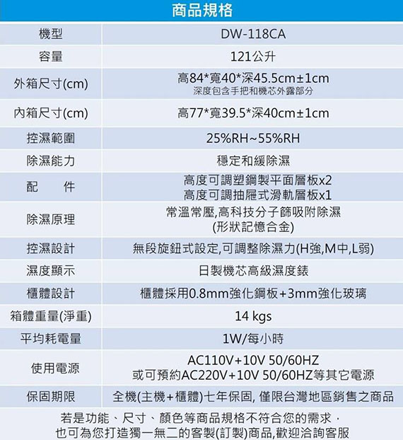 121L、外箱:H840*W400*D455mm±1cm、內箱:H770*W395*D400mm±1cm、上下可調高低層板*2、抽屜式滑軌式拖盤*1、採智慧型無段式控制、高級濕度錶顯示、櫃體採用0.8mm強化鋼板加特選耐磨烤漆3mm強化玻璃、台灣製造、七年保固