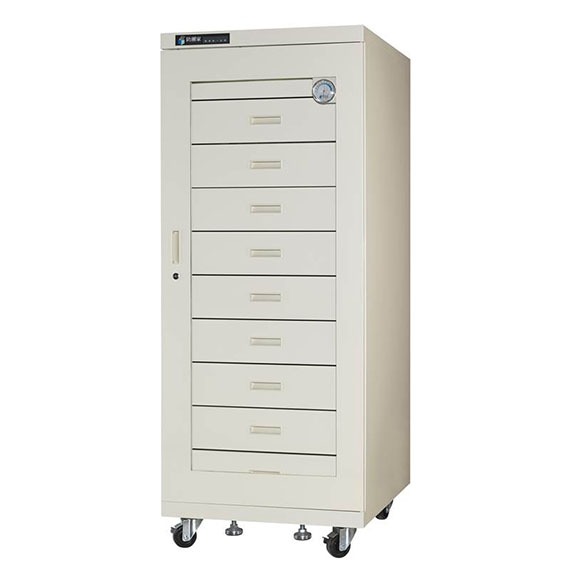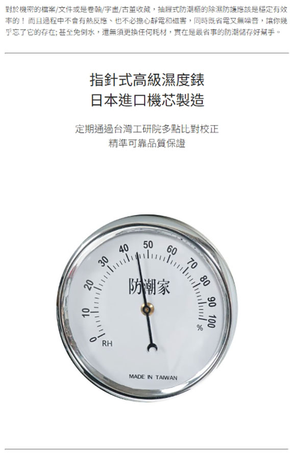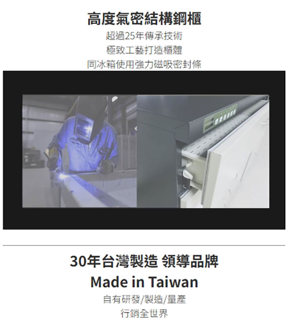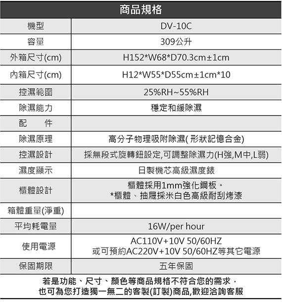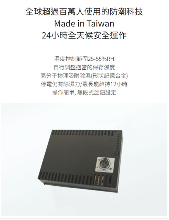 容量756公升,濕度控制範圍25-55%RH,高分子物理吸附除濕,形狀記憶合金,停電仍有除濕力/最長能維持12小時,高度氣密結構鋼櫃,Made in Taiwan,中鋼特級1mm強化鋼板,全拉式滑軌,特殊載重設計,底部密集式沖孔設計,
