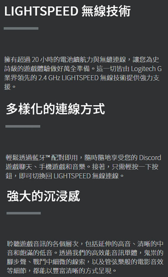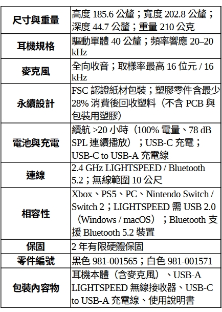 耳戴/耳罩式/護耳式/全罩,驅動單元:40mm,連接類型:2.4 GHz LIGHTSPEED/藍牙5.2,16 kHz翻轉靜音麥克風,210公克輕盈舒適,15公釐頭帶襯墊、21公釐記憶泡棉耳罩和高彈性針織布料,2年有限硬體保固(981-001565) NCC證號:耳機CCAF25LP1390T6 / 接收器 CAF25LP1400T9 BSMI認證碼: R41126