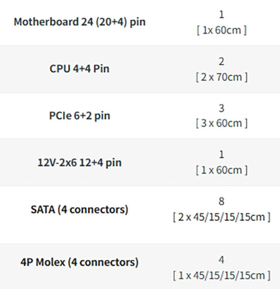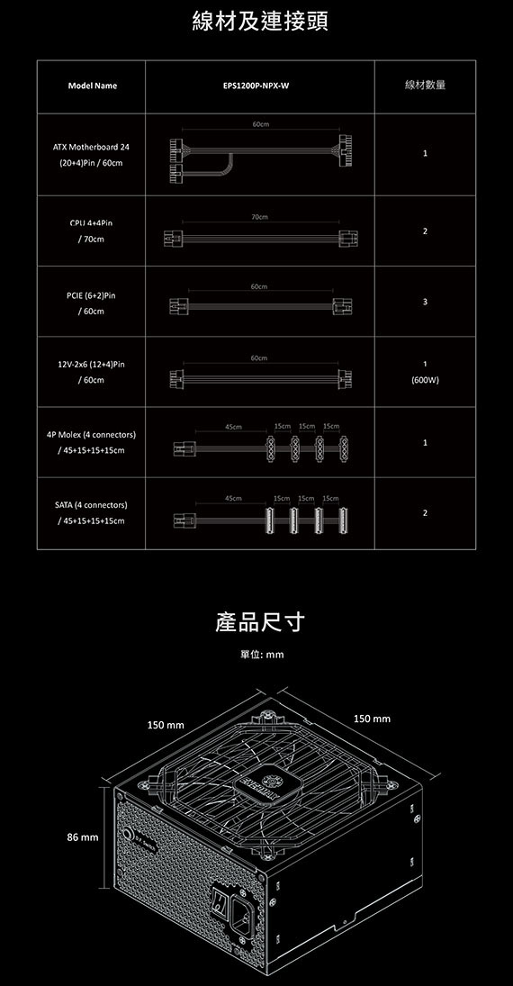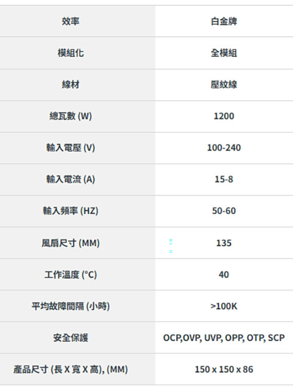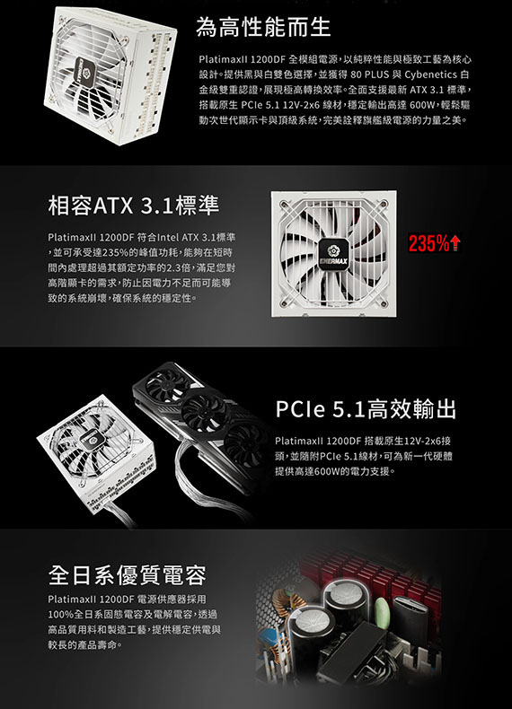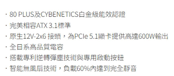 1200W,80PLUS白金牌,單組+12V,135mm風扇,Motherboard 24 (20+4) pin*1,CPU 4+4 Pin*2,PCIe 6+2 pin*3,12V-2x6 12+4 pin*1,SATA (4 connectors)*8,4P Molex (4 connectors)*4,完美相容ATX 3.1標準,為PCIe 5.1顯卡提供高達600W輸出,專利逆轉彈塵技術,13年保固