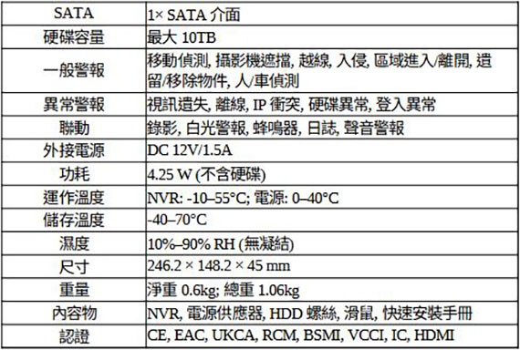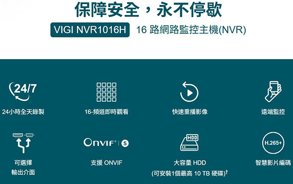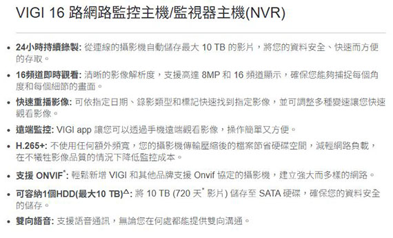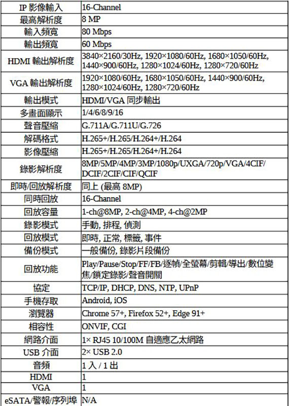 16頻道IP影片輸入最高8 MP解析度,錄影解析度8 MP/5 MP,輸出解析度1920x1080p/60Hz,支援H.265+智慧影片編碼24小時全天錄製,快速重播影像,遠端監控,ONVIF 確保相容性,最多可儲存 720 天影像,大容量HDD(可安裝1個最高 10 TB 硬碟),雙向語音,介面:1*10/100 Mbps RJ-45,2*USB 2.0
