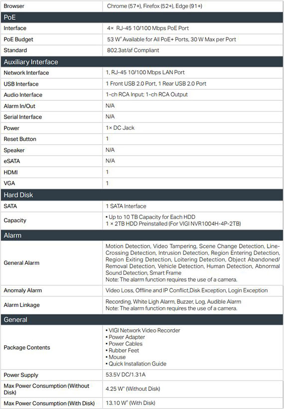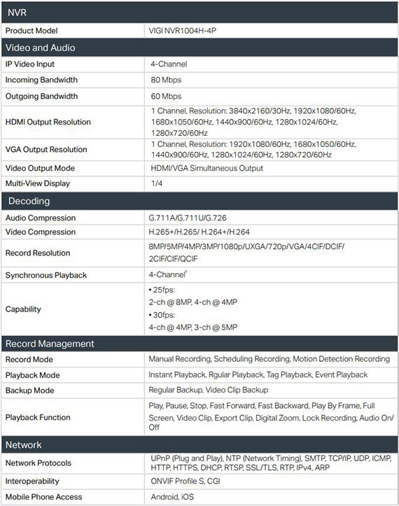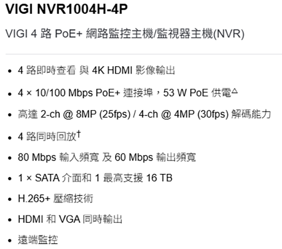 外部介面:4*10/100Mbps PoE+連接埠(53W PoE供電)、2*USB2.0、1*聲音輸入、1*聲音輸出、1*D-Sub(VGA)、1*HDMI、1*SATA介面(最高支援16TB)、4路即時查看與4K HDMI影像輸出、4MP(25fps)解碼能力、80Mbps輸入頻寬及60Mbps輸出頻寬、H.265+壓縮技術、遠端監控