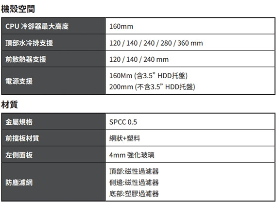 2.5/3.5吋*2,2.5吋*1,主板支援ATX、M-ATX 、ITX,擴充槽*7,CPU散熱器最大高度160mm,最大GPU長度390mm,電源支援最大200mm(未安裝 3.5 吋硬碟托盤),支援風扇(無標示內建即選購): 上蓋:3*120mm/2*140mm,前部:3*120mm/2*140mm,背部:1*120mm,側面2*120mm,支援水冷(無標示內建即選購):頂部120/360mm*1,前板120/240mm,後板120mm*1,I/O:USB 5Gbps(Type-A)*2,顯示ARGB燈光效果,磁性防塵過濾網
