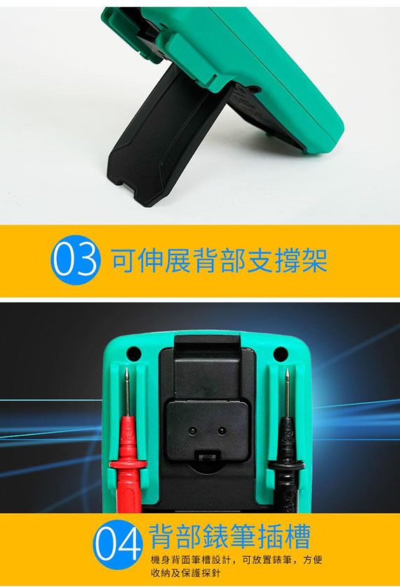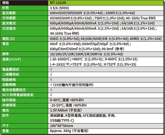 LCD液晶背光顯示,3-5/6位數,最大讀值5999,最佳精確度:最佳精確度:0.5%,寶工有效值高能芯片,USB Type-C線與電腦連接,防震外殼保護,可量測直流電壓、交流電壓、直流電流、交流電流、電阻、電容、頻率、溫度(℃/℉)、二極體、電晶體