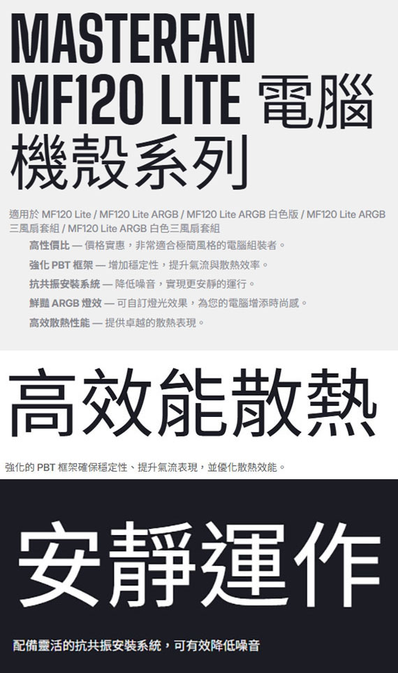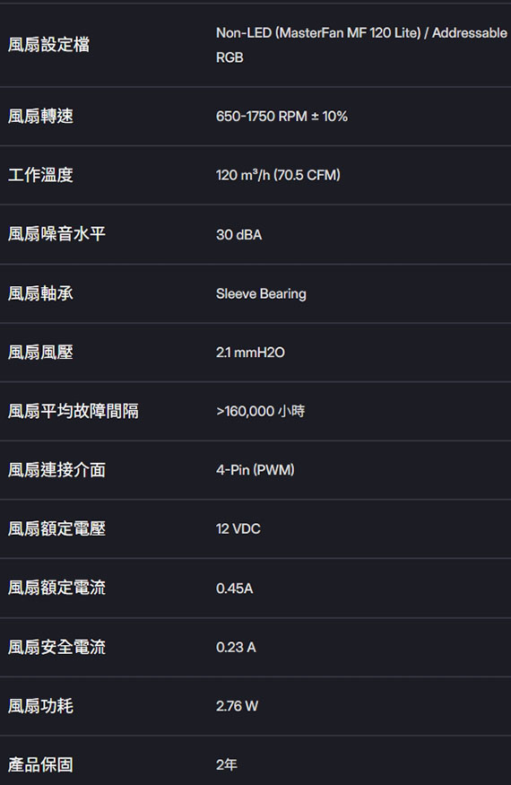 風扇轉速650-1750 RPM±10%,噪音水平30dBA,Sleeve Bearing軸承,風壓2.1mmH2O,連接介面4-Pin(PWM),抗共振安裝系統,強化的PBT框架,Addressable RGB,2年保固
