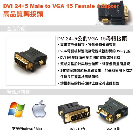 DVI 29pin(24+5)公(Dual Link DVI-I公)<-->VGA/D-Sub母15pin,24K鍍金觸頭,VGA電腦線材連接至電視或投影機的DVI-I孔座,DVI-I連接設備連接至您的電腦或投影機,鑄模製造的轉接頭附上固定孔座螺絲釘