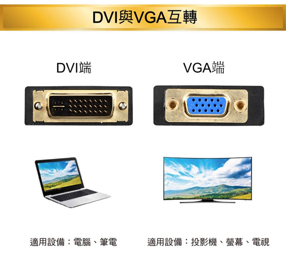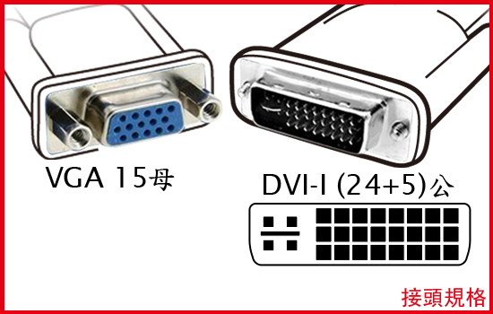 DVI 29pin(24+5)公(Dual Link DVI-I公)<-->VGA/D-Sub母15pin,鍍金接座,PVC包覆式射出一體成型,接座螺絲設計
