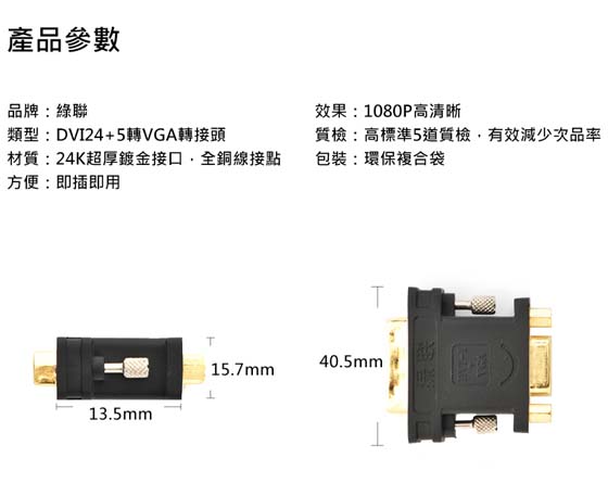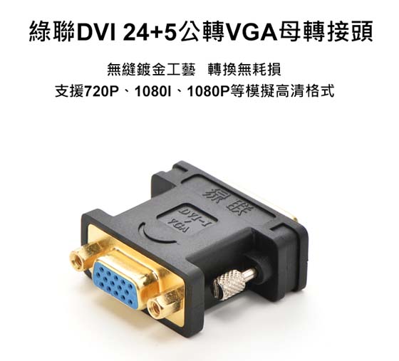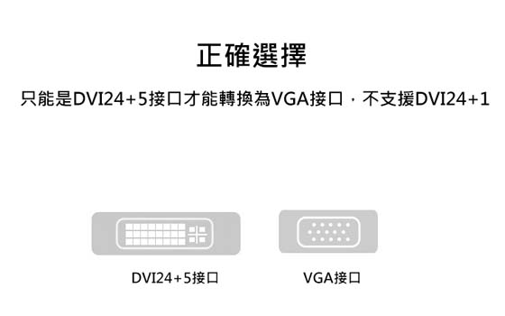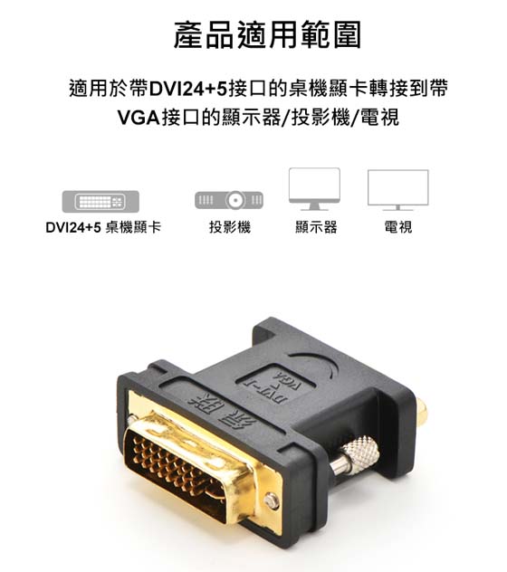 DVI 29pin(24+5)公(Dual Link DVI-I公)<-->VGA/D-Sub母15pin,24K超厚鍍金端子,適用於帶DVI24+5接口的桌機顯卡轉接到帶VGA接口的顯示器