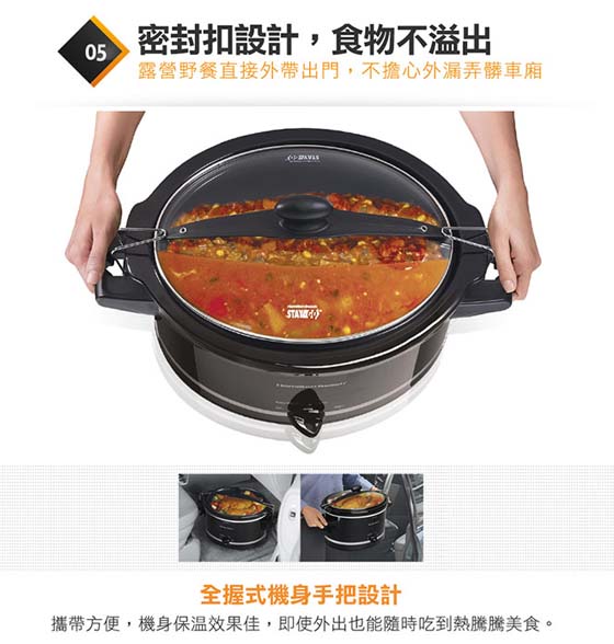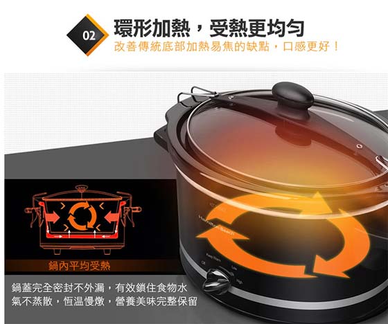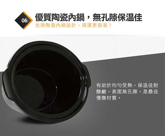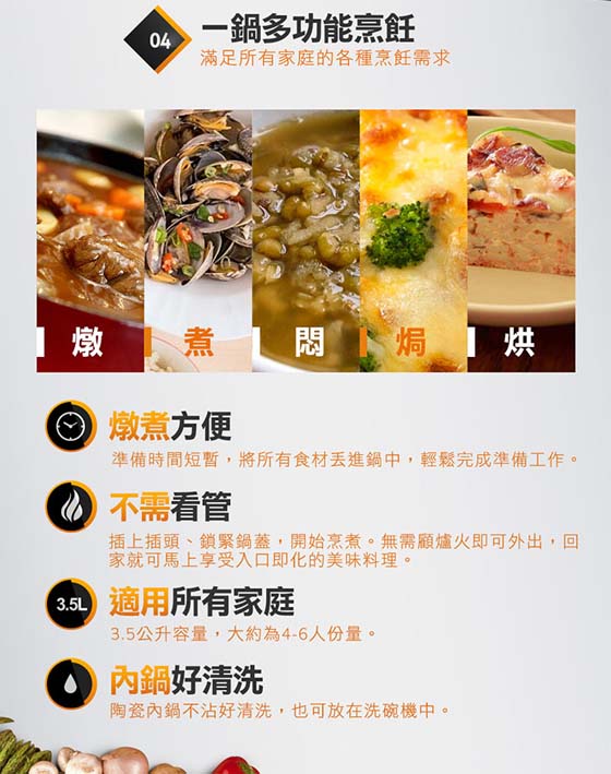 容量:3.5L ,保留食物原汁原味,營養不流失 ,無油煙/致癌物產生,低溫長時烹煮,保留最佳口感, 一鍋多用,燉/煮/悶/焗/烘,密封扣設計,攜帶外出不怕食物外漏 ,優質陶瓷內鍋,無孔隙保溫佳