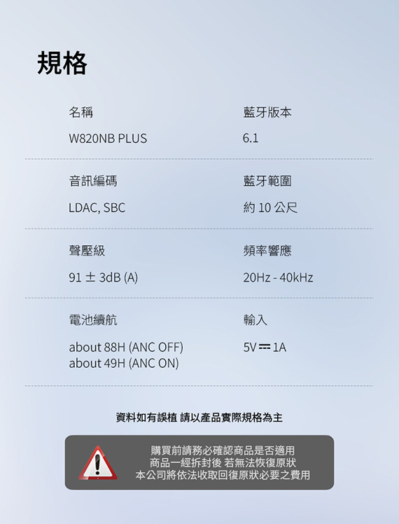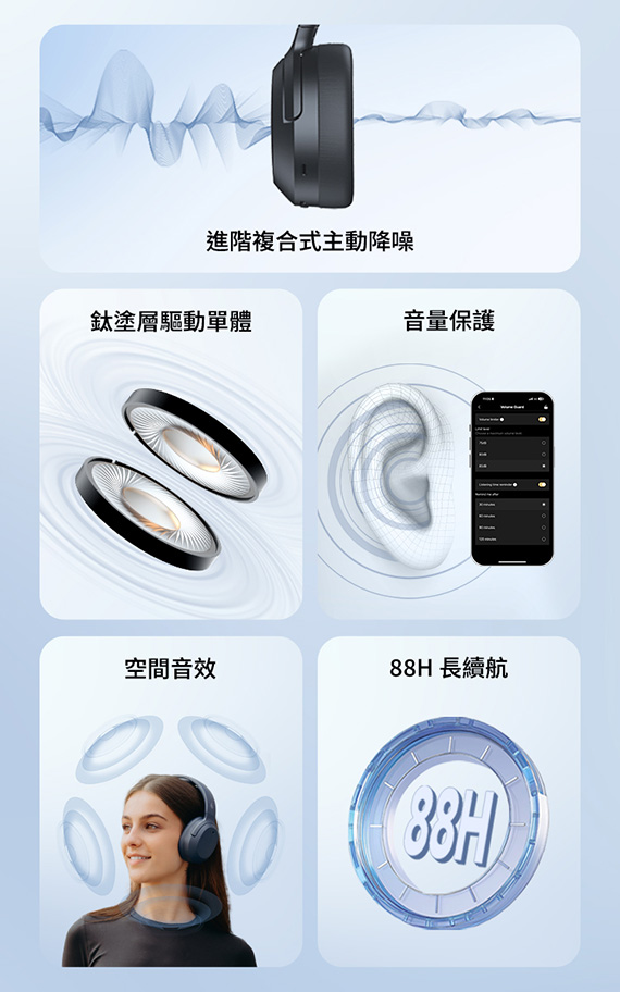 頭戴/耳罩式/護耳式/全罩,40mm鈦塗層驅動單體,藍牙6.1,Type-C充電,88H超長續航,ANC ON約49H工作時間,支援快充15分鐘=15小時,Hi-Res 雙金標音質認證,-49dB ANC 深度主動降噪,AI 深度通話降噪,可折疊收納,低延遲遊戲模式,雙設備連接 NCC認證碼: CCAH25LP5500T1 BSMI認證碼: R3B489