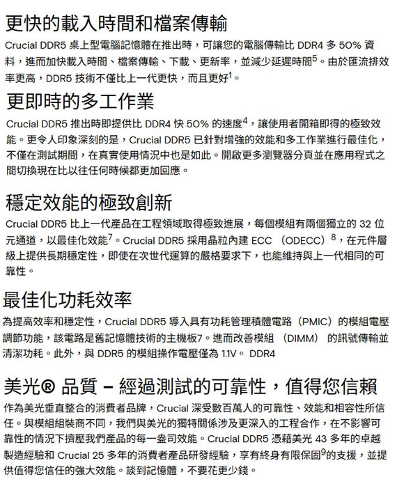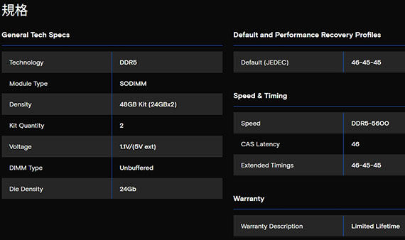 頻率:DDR5 5600,針腳及模組:262-pin SODIMM,CL值:46-45-45,電壓:1.1V , 內建PMIC電源管理晶片,Unbuffered,終身有限保固