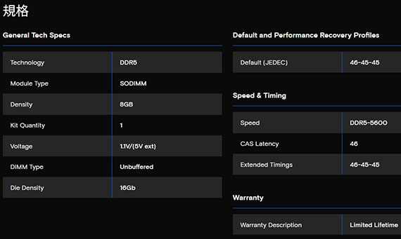 頻率:DDR5 5600,針腳及模組:262-pin SODIMM,CL值:46-45-45,電壓:1.1V,內建PMIC電源管理晶片,原生顆粒,Unbuffered,終身有限保固