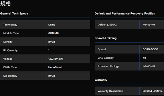 頻率:DDR5 5600,針腳及模組:262-pin SODIMM,CL值:46-45-45,電壓:1.1V,內建PMIC電源管理晶片,原生顆粒,Unbuffered,終身有限保固