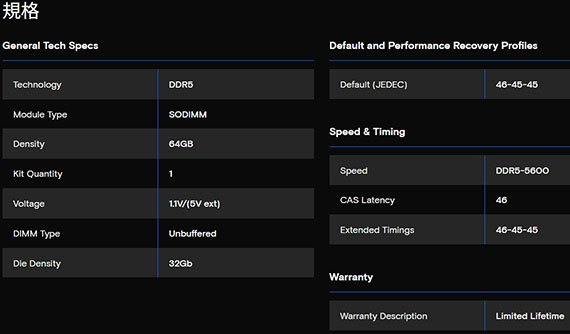 頻率:DDR5 5600,針腳及模組:262-pin SODIMM,CL值:46-45-45,電壓:1.1V,內建PMIC電源管理晶片,原生顆粒,Unbuffered,終身有限保固