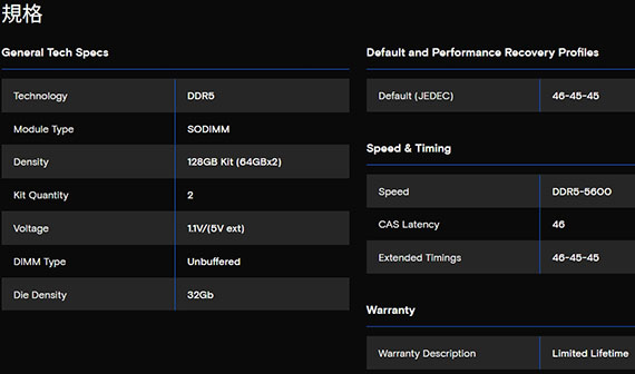 頻率:DDR5 5600,針腳及模組:262-pin SODIMM,CL值:46-45-45,電壓:1.1V , 內建PMIC電源管理晶片,Unbuffered,終身有限保固