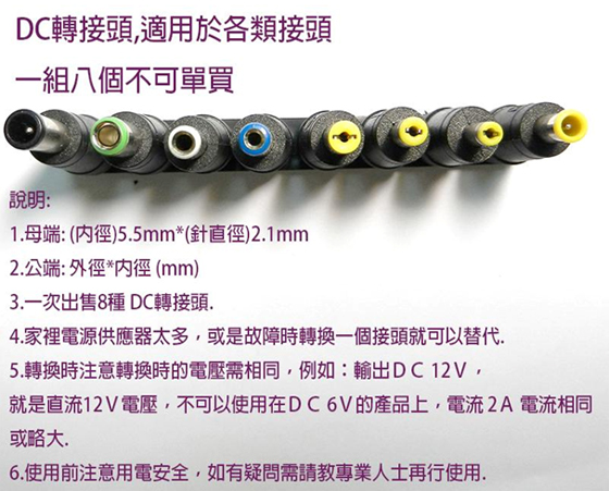 DC轉接頭,母端:內徑5.5mm X 針直徑2.1mm,轉換時注意電壓需相同,並注意用電安全