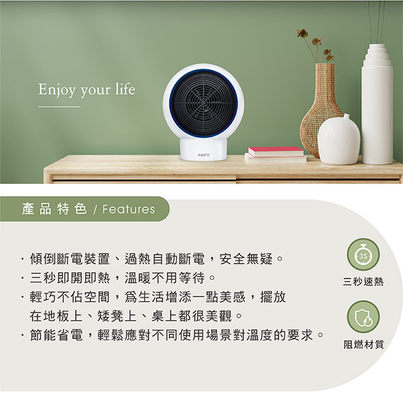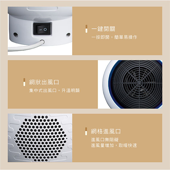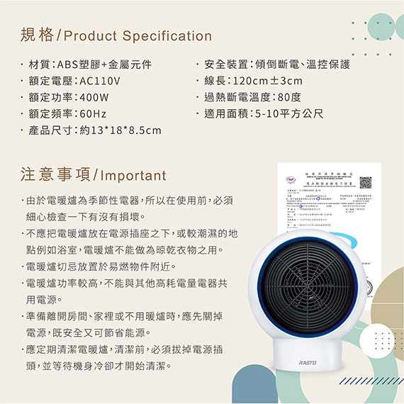 400W,4.1吋~8吋,電壓:AC110V,一般插頭式,80度過熱斷電,防傾倒保護,三秒速熱,阻燃材質,溫控保護,一鍵開關,網狀出風口,網格進風口,線長:120cm±3cm,保固一年