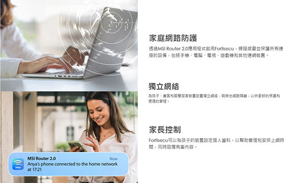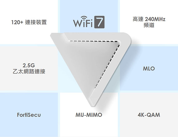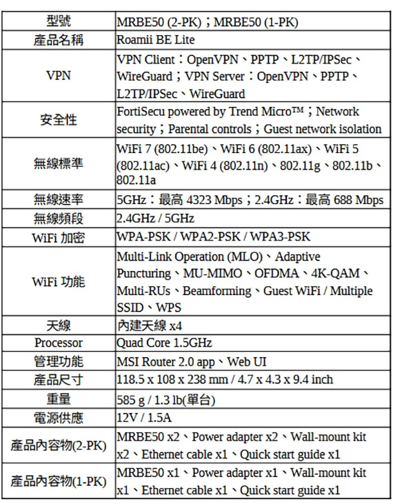 雙頻WiFi 7、傳輸速度高達約5000Mbps、1.5GHz四核處理器、256MB快閃記憶體和2GB DDR4 RAM、內建天線*4、多重連接模式技術(MLO)、4K-QAM和MU-MIMO、雙入組覆蓋達165坪、支援120多台裝置、MSI FortiSecu提供全面的安全保護和家長控制功能、使用MSI Roamii應用程式網狀網絡、介面:1*2.5Gbps、2*1Gbps、三年保固