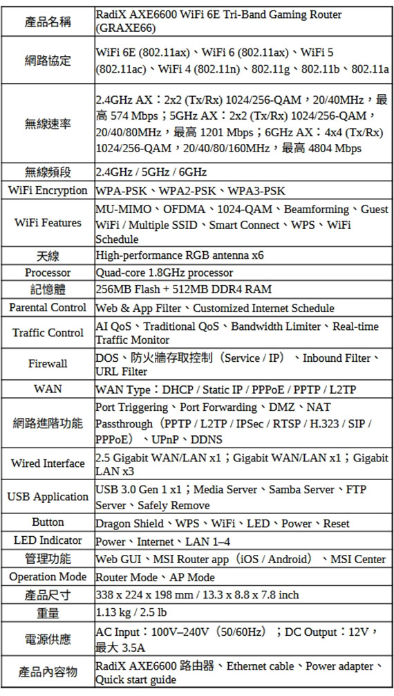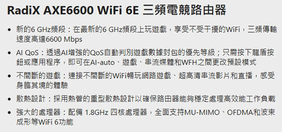 三頻傳輸速度高達約6600Mbps、1.8GHz四核處理器、全面支持MU-MIMO、OFDMA和波束成形等WiFi 6功能、透過AI增強的QoS自動判別遊戲數據封包的優先等級/自定義天線及龍盾LOGO燈效顏色、採用熱管的重型散熱設計、介面:1*2.5G連接埠、4*Gigabit連接埠、1*USB3.0、三年保固 NCC認證碼: CCAH23LPA140T0