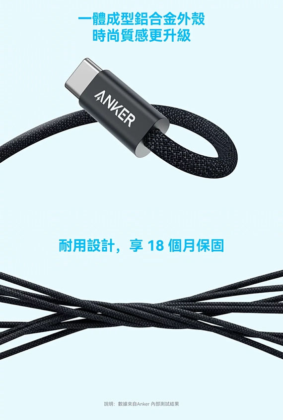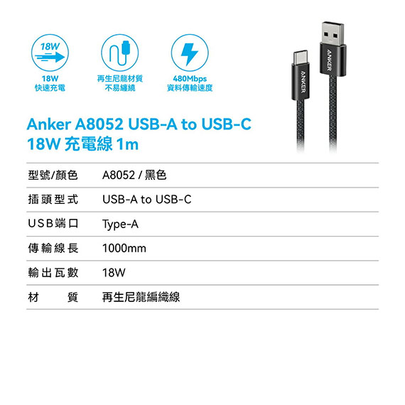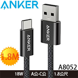 ANKER A8052 黑色 18W 編織 Type-C USB傳輸線 A公-C公 1.8M