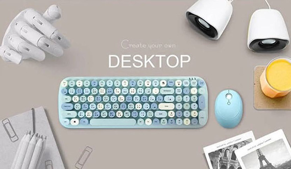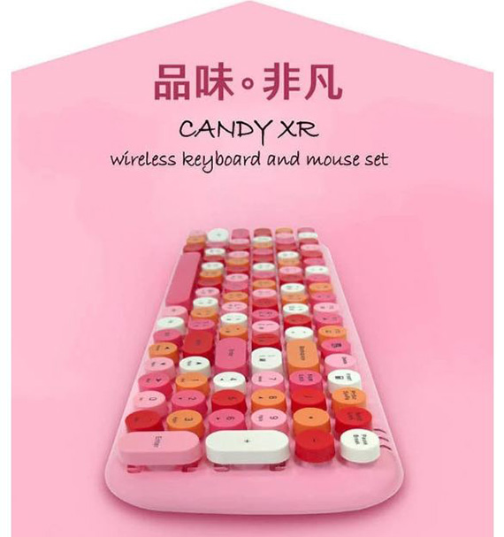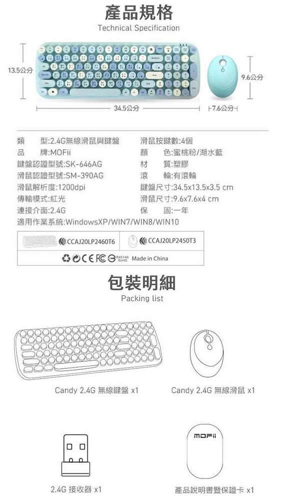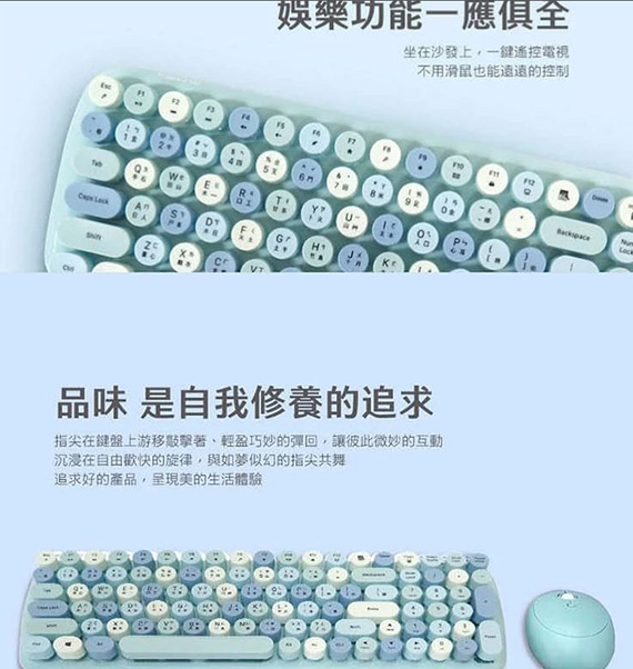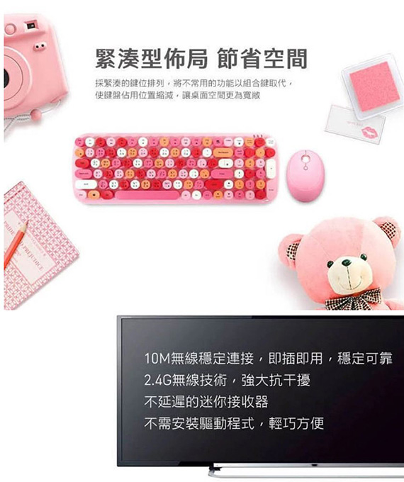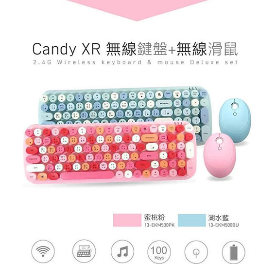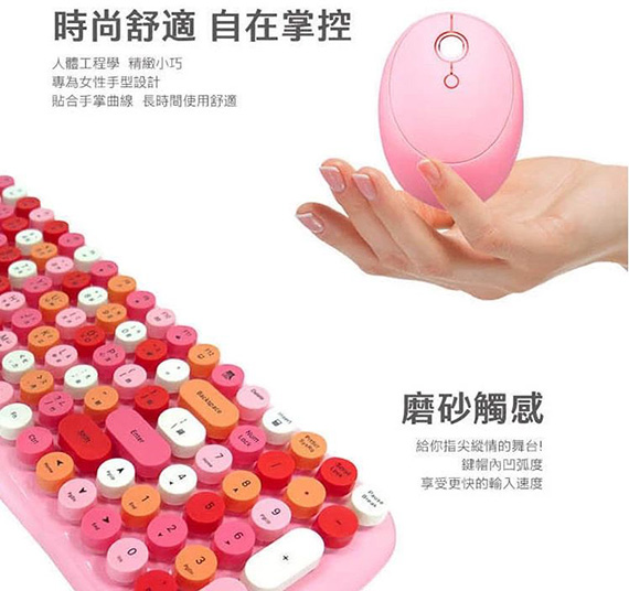 鍵盤:2.4G無線介面、100鍵、復古圓形鍵帽、多色混彩鍵帽設計、多媒體快捷鍵、滑鼠:解析度1200dpi、4按鍵、專為女性手型設計、磨砂觸感、使用3號電池(AA)*1(另購)