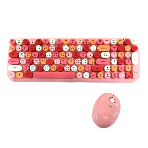 鍵盤:2.4G無線介面、100鍵、復古圓形鍵帽、多色混彩鍵帽設計、多媒體快捷鍵、滑鼠:解析度1200dpi、4按鍵、專為女性手型設計、磨砂觸感、使用3號電池(AA)*1(另購)