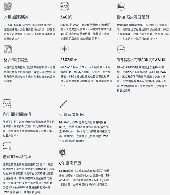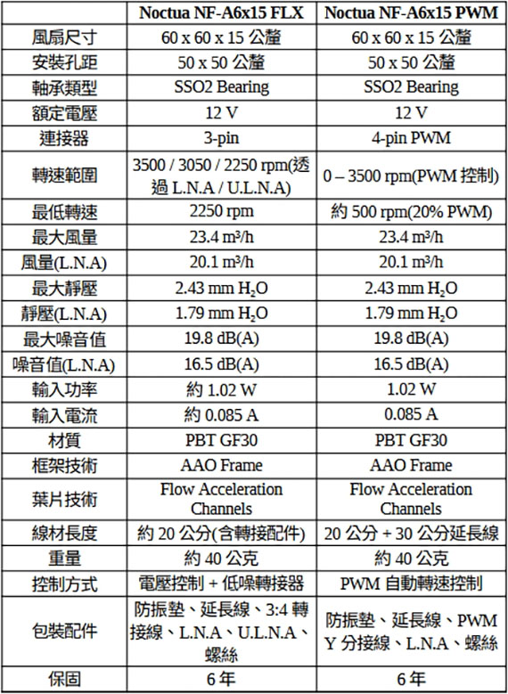 尺寸:60x60x15mm,7葉片,3-pin 接頭,風量:23.4m3/h,轉速3500RPM±10%,靜壓:2.43mmH2O,噪音值:19.8dB(A),採用先進的空氣動力學設計,AAO框架,SSO2軸承,六年保固