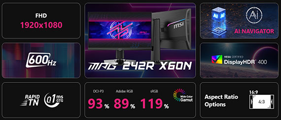 MSI MPG 242R X60N電競螢幕採用 Rapid TN 面板,搭載 600Hz 超高刷新率與 AI Navigator 技術,帶來升級的遊戲體驗。24 吋高效能 Rapid TN 顯示器具備 0.1ms(GtG,最小值)極速反應時間,並通過 VESA DisplayHDR 400 認證,展現清晰明亮的畫面表現。專為電競賽事打造,是職業選手和競技玩家的理想之選。