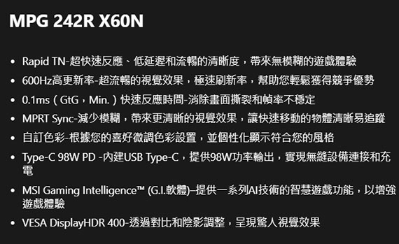 MSI微星 MPG 242R X60N 24型 16:9 24.1吋 電競螢幕 (TN/0.1ms/600Hz/1C2H1DP)