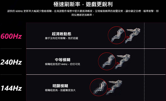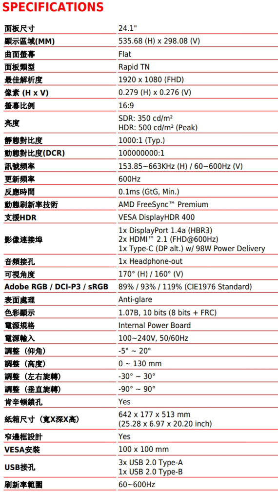 24.1吋,比例16:9,Rapid TN 平面,解析度1920x1080(FHD),刷新率600Hz,反應時間0.1ms(GtG, Min.),對比度1000:1,動態對比度(DCR)100000000:1,亮度(nits)SDR:350cd/m2、HDR:500cd/m2(Peak),介面:2*HDMI 2.1、1*DisplayPort 1.4a、1*Type-C、3*USB 2.0 Type-A、1*USB 2.0 Type-B,支援HDCP,MPRT Sync,自訂色彩,MSI Gaming Intelligence(G.I.軟體),Windows Dynamic Lighting認證,VESA DisplayHDR 400認證,3年保固
